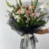 A charming duo featuring a stunning bouquet of fresh flowers and a delectable cake, perfect for celebrating any special occasion.