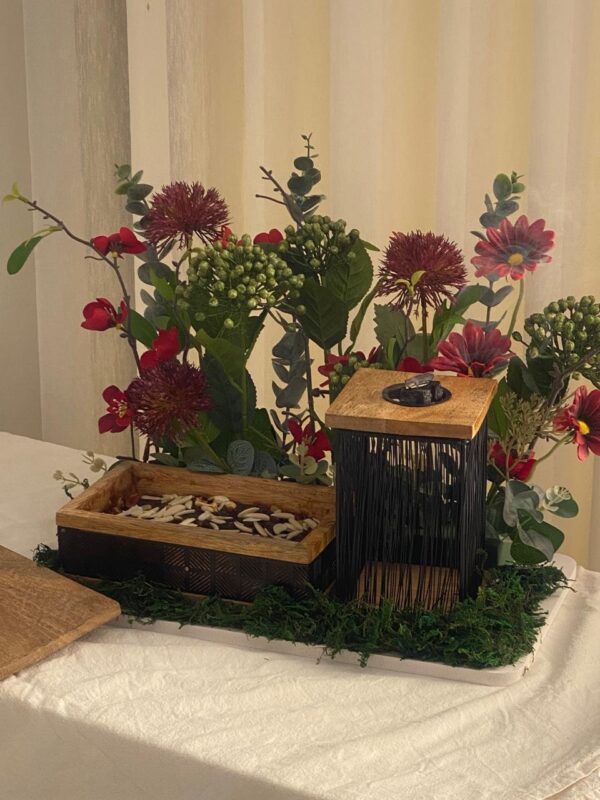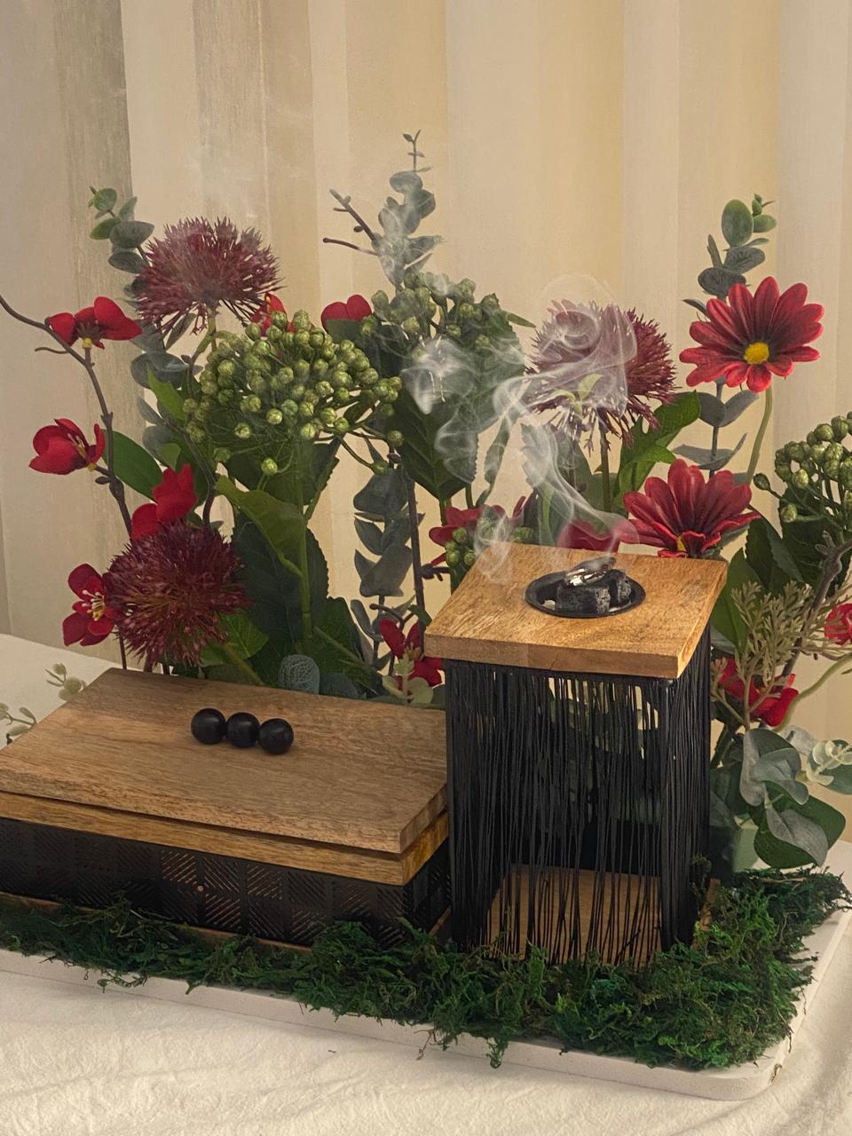 هدية العيد وتشمل مدخن مع صينية حلوى وترتيب الورد (الورد صناعي )